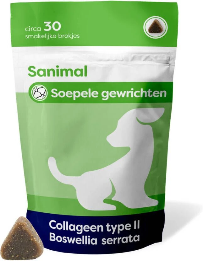 Sanimal Soepele GewrichtenSanimal Soepele Gewrichten helpt bij en voorkomt gewrichtsproblemen. Als gewrichtsproblemen optreden, dan verdwijnt kraakbeen in het gewricht sneller dan dat het wordt aangemaakt. Er ontstaat slijtage, hierdoor worden de gewrichten stijf en zal jouw hond minder makkelijk gaan bewegen. Sanimal Soepele Gewrichten heeft dezelfde samenstelling als Flexadin Advanced. * Voor alle honden vanaf 4 maanden oud die gewrichtsondersteuning kunnengebruiken * Ter ondersteuning van de gewrichten in het geval van (osteo)artritis * Bevat o.a. Ongedenatureerd Collageen type II en Boswellia seratta om jouwhond vitaal en gezond te houden * Voor alle honden vanaf 4 maanden oudGebruiksaanwijzingMet 1 brokje per dag is de handige hersluitbare verpakking voldoende voor 1 maand ondersteuning.Deze brokjes kun je eenvoudig toedienen: je geeft ze zo uit de hand, als een lekkere hondensnack! Dit kan op elk moment van de dag.Zorg daarbij altijd wel voor voldoende vers drinkwater en houd toezicht tijdens het eten.