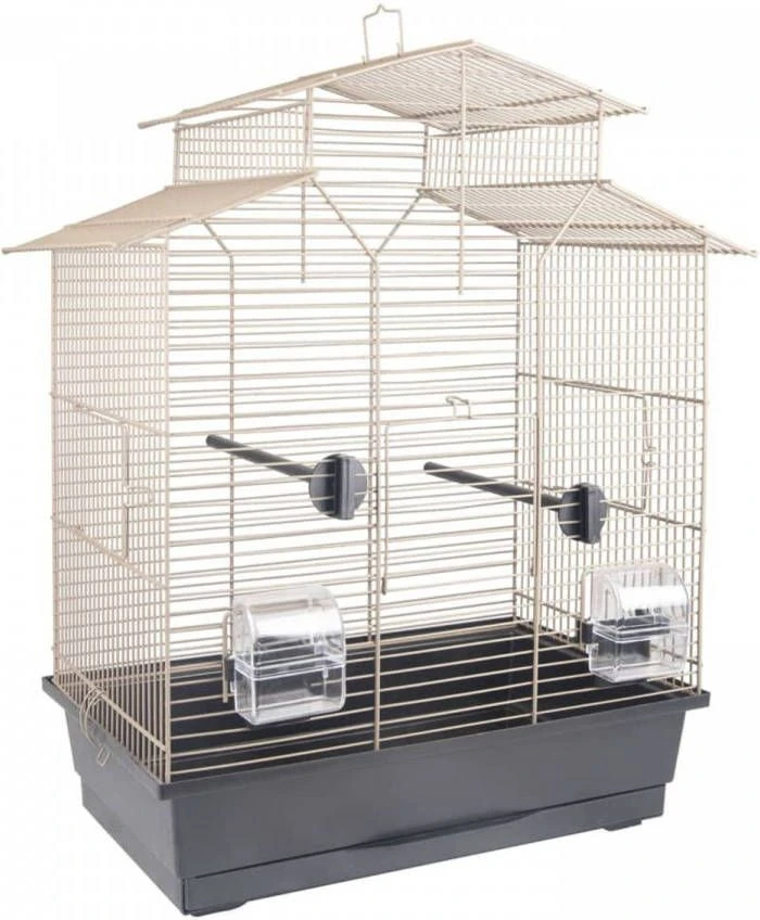 Dit stalen kooitje heeft 2 kunststof zitstokken en 2 kunststof bakjes. Dankzij deze bakjes kan je je vogel voldoende water en voer geven. Het voord.
