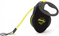 Bij Flexi kan je kiezen tussen lijnen met een koord en lijnen met tape. Het is een persoonlijke voorkeur welke variant je het fijnst vindt. In principe zijn beide soorten even sterk en veilig om te gebruiken. De Neon Giant bevat een tape.