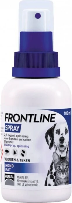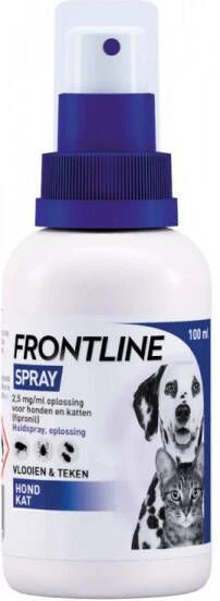 De Frontline Spray s een middel ter bestrijding van vlooien en teken bij honden en katten. Overdosering is bijna niet mogelijk dus de spray kan vrij gebruikt worden. Het mag zelfs gebruikt worden bij zogende of zwangere dieren of bij pups en kittens. Het doodt de vlooien en.