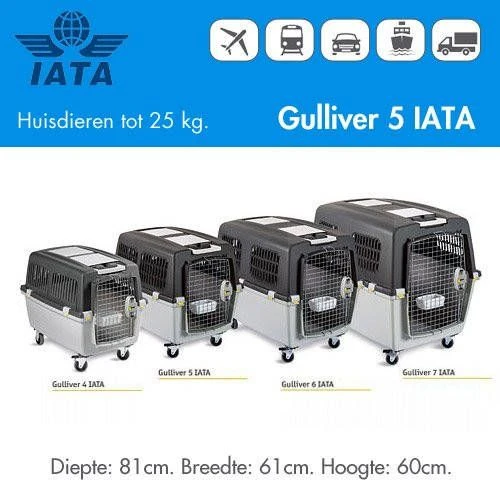 Transportbox Gulliver Mega Middelgrote honden tot 25 kg.- Afmetingen: 81 x 61 x 60 cm.Duurzame kwaliteit transportbox met metalen deur voor het comfortabel en veilig vervoeren van middelgrote honden tot 25kg. IATA gekeurd en geschikt voor reizen per vliegtuig. De luchtroosters over de hele diepte van de transportbox zorgen voor een optimale ventilatie en biedt extra comfort voor je hond.De vervoersbox is ideaal voor het reizen per auto, trein, vliegtuig, boot of camper. De ruime metalen toegangsdeur heeft een dubbelwerkend veiligheidsslot. Bovenop op de box zitten 2-handige opbergvakken voor het bewaren van bijvoorbeeld de set wielen of een extra voerbak. Het gebruik van de vervoersbox in combinatie met de handige set wielen (optioneel leverbaar) geeft je nog meer mobiliteit en gebruikersgemak. Geleverd inclusief een water/voerbak.Onder andere geschikt voor:Grote kattenrassen, Buldog, Chow Chow, Dalmatiër, Siberian Husky, Labrador Retriever.