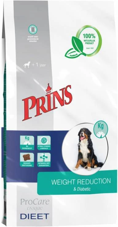 Prins ProCare Dieet Croque Weight&Diabetes HondenvoerProCare Croque Dieet Weight Reduction&Diabetic is een krokante dieetvoeding speciaal voor volwassen honden met overgewicht en/of diabetes. Deze volledige dieetvoeding helpt je hond op een verantwoorde manier af te vallen en ondersteunt de regulering van de bloedsuikerspiegel. De optimale balans van vitaminen en mineralen zorgt voor voldoende aanbod tijdens het afvalproces. De extra voedingsvezels helpen het hongergevoel te verminderen en ondersteunen je hond tijdens het afvallen. * Bij overgewicht. Laag energiegehalte en extra voedingsvezels, L-carnitine stimuleert de vetstofwisseling * Diabetes. Ter ondersteuning van honden met diabetes mellitus (suikerziekte)en een evenwichtige bloedsuikerspiegel * Hoog eiwit. Hoog eiwitgehalte zorgt voor behoud van spiermassa tijdens het afvallen * Evenwichtige bloedsuikerspiegel. Een verlaagd zetmeelgehalte ondersteunt een evenwichtige bloedsuikerspiegel. Ter ondersteuning van honden met Diabetes mellitus (suikerziekte).