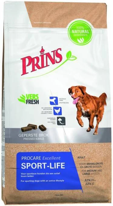 Prins Procare Sport-Life ExcellentDeze voeding is speciaal ontwikkeld voor sportieve honden die naast hun gebruikelijke dagelijkse beweging echt een paar keer per week flink sporten en topprestaties moeten leveren met een gemiddelde activiteitsduur. Zoals bijvoorbeeld werkhonden, sledehonden of honden die meerdere keren per week een hondensport beoefenen. * 100 % natuurlijke ingredinten * Geen synthetische geur-, kleur- en smaakstoffen * Eiwitbron kip en kalkoen (dragen aan de groei en instandhouding van de spiermassa) * Bevat een hoger veten eiwitgehalte om aan de behoefte van sportieve honden te voldoen * Bevat L-carnitine dat bevordert een optimale vetverbranding.