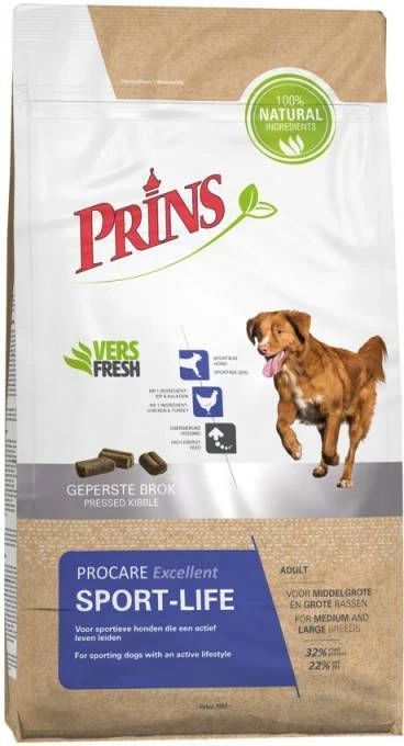 Prins Procare Sport-Life ExcellentDeze voeding is speciaal ontwikkeld voor sportieve honden die naast hun gebruikelijke dagelijkse beweging echt een paar keer per week flink sporten en topprestaties moeten leveren met een gemiddelde activiteitsduur.