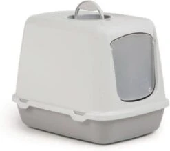 Kattenbak Oscar Een stevige kattenbak van Savic in de kleur grijs/wit. Dit toilet is voorzien van een * deurtje * filter * handvat.