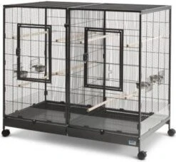 Een groot voordeel aan de Tasmania 120 is dat deze komt met een scheidingstralies. Wanneer je nieuwe vogels hebt of twee vogels die op dit moment niet goed samen kunnen, is het mogelijk om ze beide een eigen plek te geven door de fijne scheiding. De kooi wordt geleverd met vier 360°-draaibare wielen waarvan twee met rem. Ook 8 zitstokken, 4 roestvrijstalen voerbakken met 6 hangers en 6 anti-vuilschermen worden meegeleverd. De kooi is uit te breiden met een los houten plankenset zodat hij geschikt wordt voor knaagdieren zoals ratten of chinchilla’s.