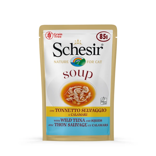 Serveer de Schesir Cat Soup Wilde Tonijn & Inktvis als aanvulling op de gebruikelijke brokjes ter variatie van het dieet of om de eetlust van uw kat te stimuleren.