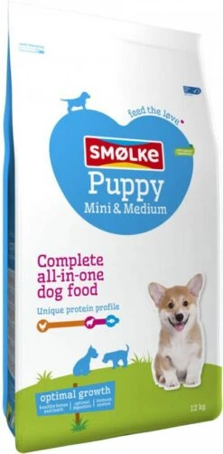 Smølke Puppy Mini-Medium is een complete Alles-in-één hondenvoeding afgestemd op de behoefte van puppy’s tot 10-12 maanden en met een maximaal volwassen gewicht van 30kg.