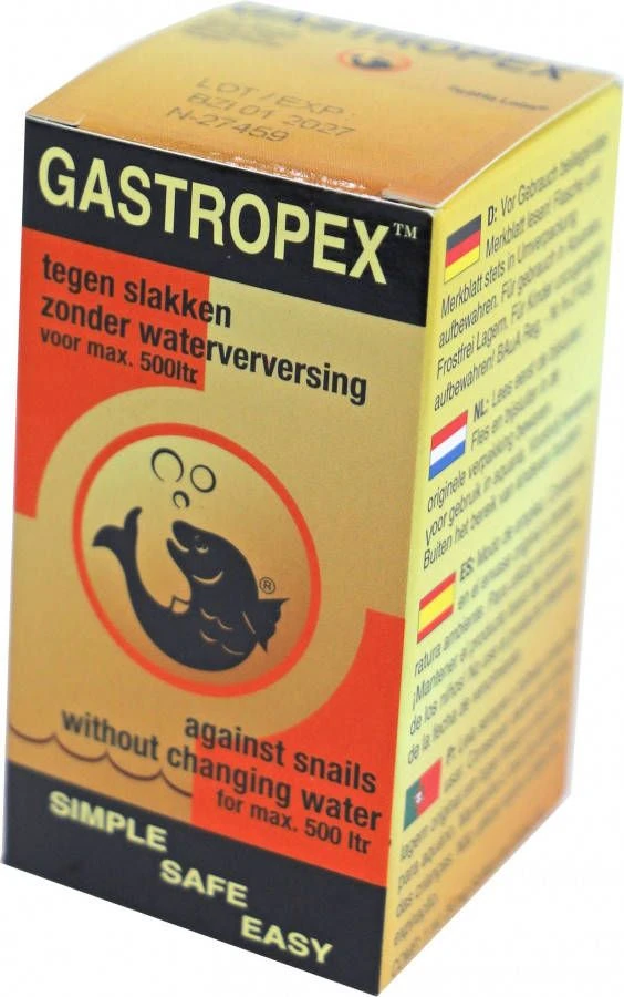 Esha Gastropex tegen slakken Bestrijdt slakken in het aquarium. Werkt tegen slakken. zonder extra waterverversing. Bestrijdt buiten slakken ook infusorin. watertroebling (bacterin). poliepen en hydra`s. * 10 ml kan gebruikt worden voor maximaal 500 liter zoetwater.