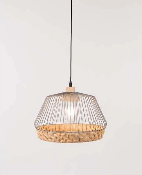 De Birdy Wide hanglamp van Zuiver heeft een lampenkap gemaakt van ijzerdraad met een matte grijze kleur. Aan de onderkant van de kap vind je een rand van gevlochten rotan en aan de bovenkant een solide lamphouder van rubberhout. De lamp heeft een hoogte van 27 centimeter. Je gebruikt in de E27 fitting van Birdy Wide een normale lamp van maximaal 40 watt.